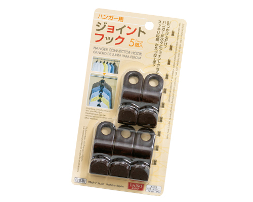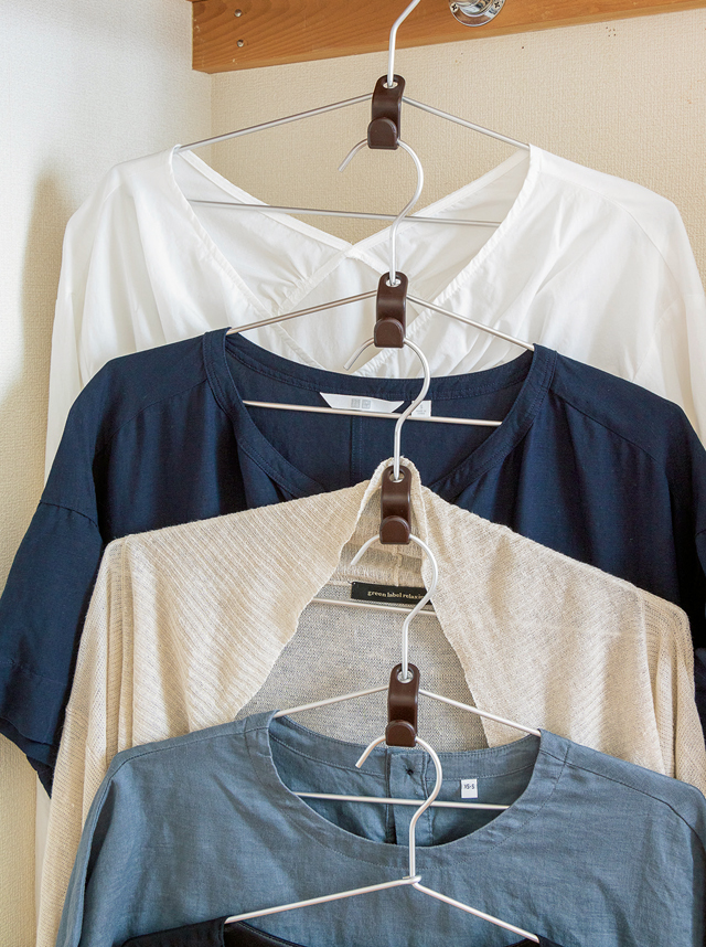 ハンガーのフック部分にジョイントフックの穴を通し、ハンガーを連結。「単品で使えて好きな数だけ連結できるので、スペースが有効活用できます。フックに掛けるハンガーは細めのものが向きます」(大沢さん)。特にポール幅が短いクローゼットやたんすにおすすめ。