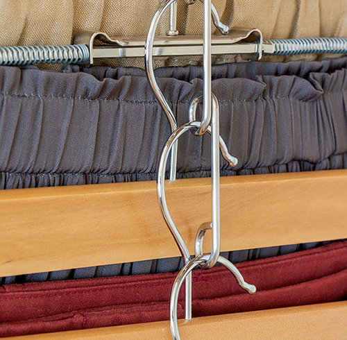 ホルダーの輪にハンガーを掛けるだけで、スカートやスラックスがコンパクトに。「本体自体がスリムなのでかさばらないのがいいところ。ボトムスはもちろん、シャツの収納にもおすすめ」(大沢さん)。輪の径が小さいので、フック部分が細いハンガーを使って。