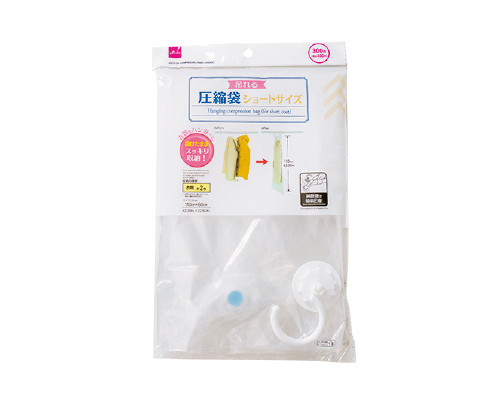 ハンガーごと圧縮袋に入れて空気を抜けば、ダウンコートなど場所をとる厚物衣類がペタンコに。「このタイプの圧縮袋はダイソーだけ。ハンガーごとつるせるのが画期的」(清水さん)。ショートタイプと、ロングタイプがあります。300円