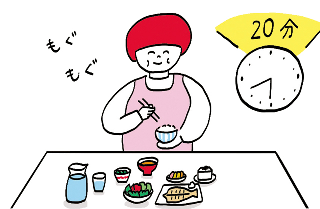 1口につき20回、最低でも10回かむようにすれば、満腹感が得られます。早食いは避け、20分以上かけて食べるように意識します。