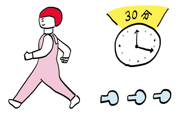 脂肪の燃焼には、30分間の早歩きが効果的。息がはずむ程度の速度で週3回行います。基礎疾患がある人は、医師と相談の上で実施を。