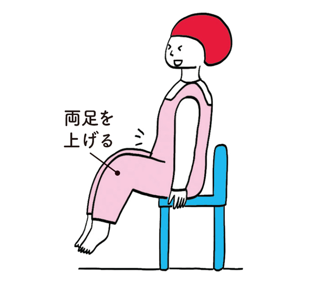 いすに座り、左の太ももをいすから少し上げるようにして30秒間保つ。右足も同様に。