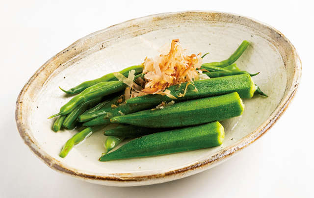 (1)オクラはガクをぐるりとむく。いんげんは筋を取り、それぞれ茹でてざるに上げ、器に盛る。